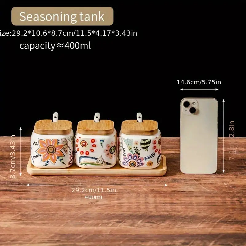 A beautifully crafted ceramic spice jar set featuring hand-painted floral designs and smooth bamboo lids. Each jar includes a matching ceramic spoon and rests neatly in a solid bamboo tray, adding charm and functionality to your kitchen. Ideal for storing salt, sugar, or spices, it blends practicality with artisanal appeal.