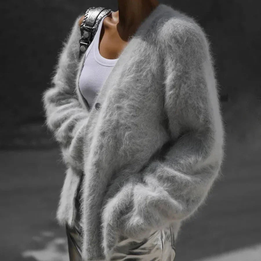 Crafted from a premium ultra-soft wool blend, the Capri Prestige Wool Cardigan drapes luxuriously for weightless warmth and refined comfort. Its single-breasted V-neck silhouette offers an elegant statement, while the intentionally oversized fit ensures effortless layering and chic versatility. Finished with reinforced ribbed cuffs and hem, it elevates any ensemble with subtle sophistication.